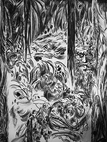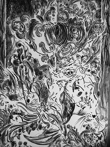 Sans titre 2, 2014-2015. 76 x 56 cm. Encre, fusain, graphite, marqueur sur papier.