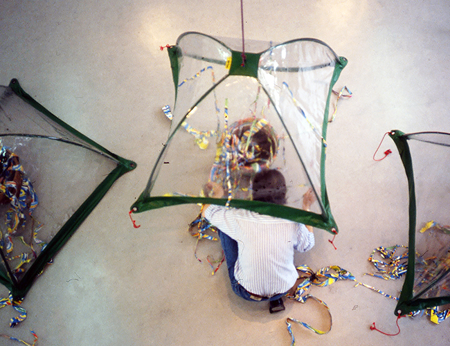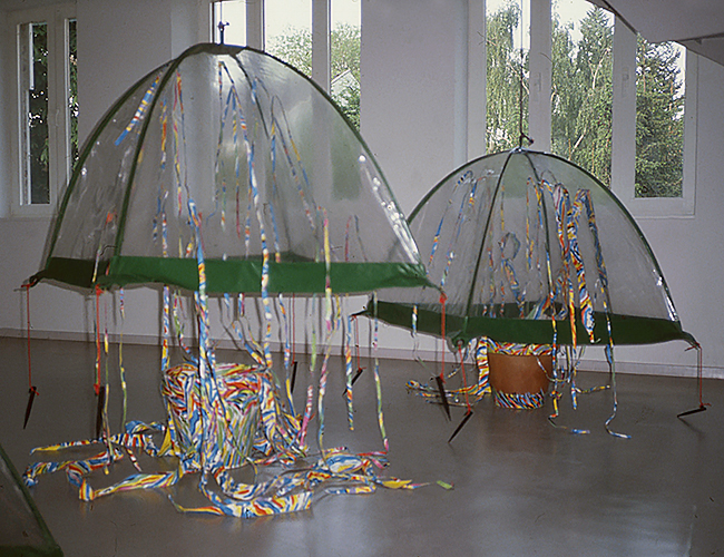 Parapluie, 1990 -1991, Centre culturel Pleussmühle. Acrylique, cordes, serre et pot.